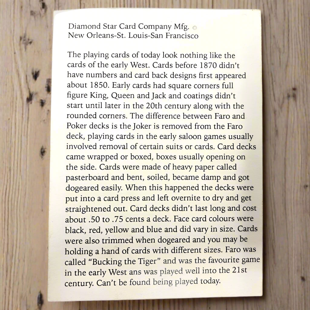 Step into the 19th-century saloons and gambling halls with this Old West Pharo poker deck. Featuring authentic square corners and period-accurate design, each card captures the spirit of the era with remarkable detail. The 52-card set includes a storage box and a history card offering intriguing insights and stories from the 1870s. Sized at 4" by 3", these cards are crafted for ease of handling and shuffling, ideal for classic card games of the Old West. Weighing just 3 ounces, this deck combines historical authenticity with practical use.