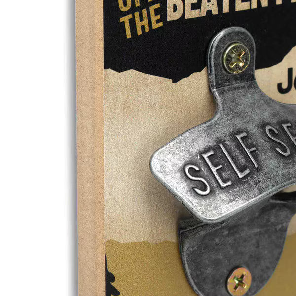 This officially licensed Jeep wall décor inspires you to hit the trails with its rugged design. Featuring an earthy color palette, the Jeep logo, the phrase “Off the beaten path,” and a Jeep silhouette, it captures the spirit of outdoor adventure. Equipped with a sturdy metal bottle opener mounted on a wood plaque, it also includes hanging hardware for easy display. Perfect for adding practical style to your garage, workshop, or man cave. Dimensions: 3.5" W x 6" H x 0.375" D.
