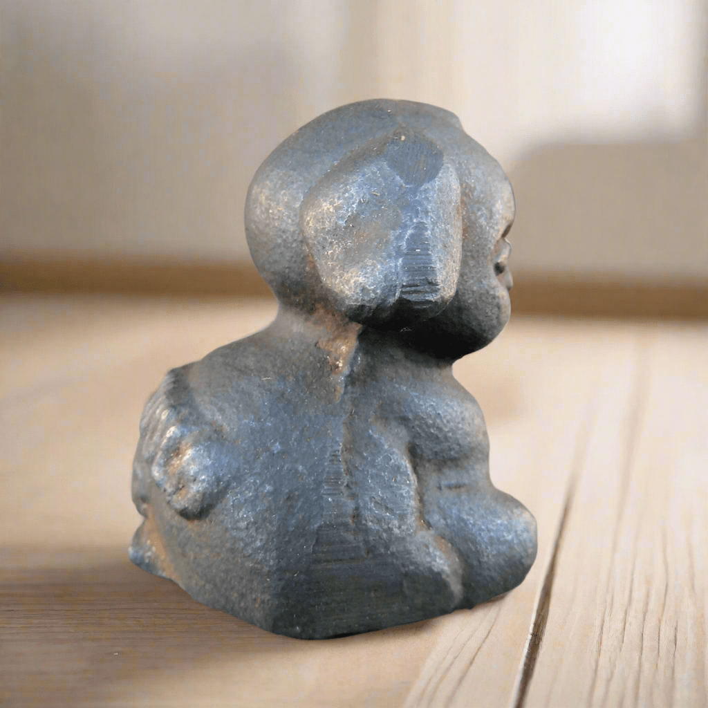 The Griswold Pup Paperweight is expertly crafted from durable cast iron, ensuring longevity and resilience. Standing 1.5 inches tall, this compact piece features raised lettering and an antique finish that highlights its vintage charm. Weighing 3 ounces, it offers enough heft to keep your papers securely in place while adding a classic, refined touch to your workspace. Ideal for collectors and professionals alike, this paperweight blends functionality with timeless design, making it a subtle yet distinctive desk accessory.